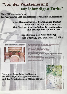 vom 15.Juni bis zum 13. Juli 2018 war in der Neustadtkirche St. Johnnes Baptist eine Bilderausstellung des Warburger VHS-Kunstkurses Udalrike Hamelmann zu sehen.